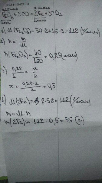 а)Вычислите массу металла, полученного восстановлением оксидом углерода (II) из оксида железа (III) массой 40г. Fe2O3 + 3CO → 2Fe + 3CO2