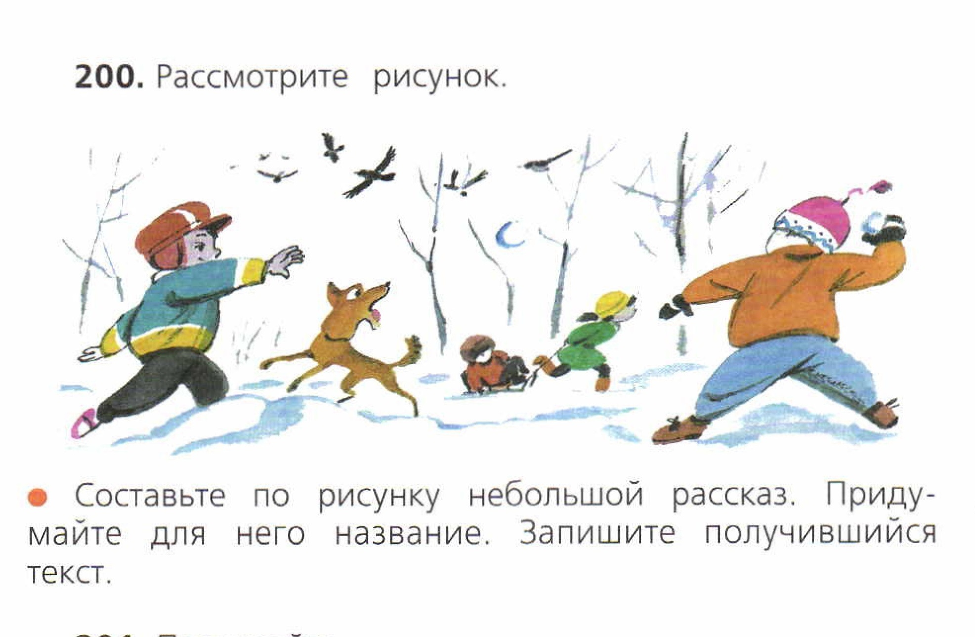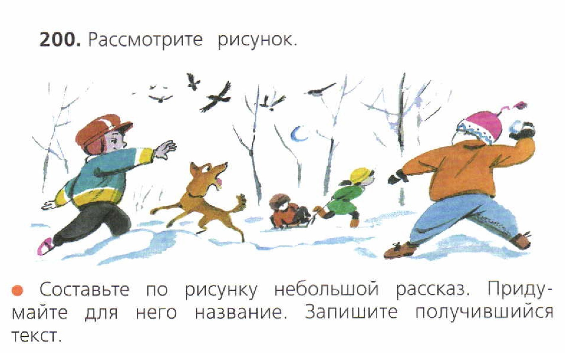русский язык 2 класс страничка 123 упр 200 составить небольшой рассказ на рисунке изображено-зима ребята играют в снежки,девочка катается на санках рядом собака.