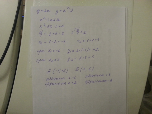 На рисунке изображены графики функций y = 2x и y = x² - 3. пересекающиеся в точках А и В. Найдите ординату точки А