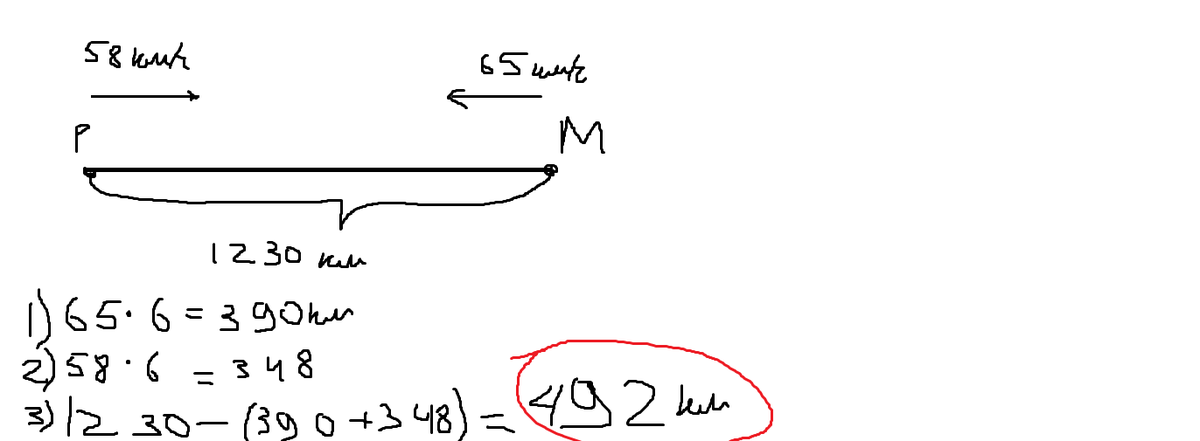 Решите задачу:Из Москвы и Ростова-на -Дону одновременно вышли навстречу друг-другу два поезда.Поезд из Москвы шел со скоростью 65км/ч а поезд из Ростова-на Дону - со скоростью на 7 км меньше .На каком расстояние друг от друга будут поезда через 6 ч после начала движения ,если расстояние между Москвой и Ростовом-на Дону 1230 км???Дам 40 баллов