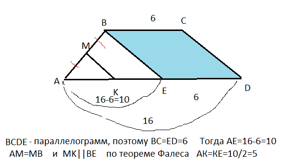 ДАНО: АВСД - трапеция, МК, ВЕ, СД параллельны, АД=16, АМ=МВ, точка М принадлежит стороне АВ, точки К и Е принадлежат стороне АД .BC=6 см НАЙТИ: АК