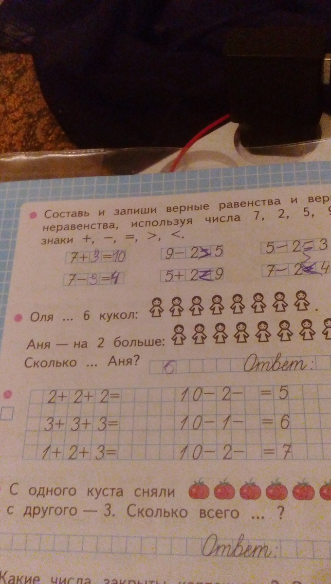 Оля раскрасила 6 кукол, Аня на 2 больше,ответ Аня раскрасила 8 кукол.