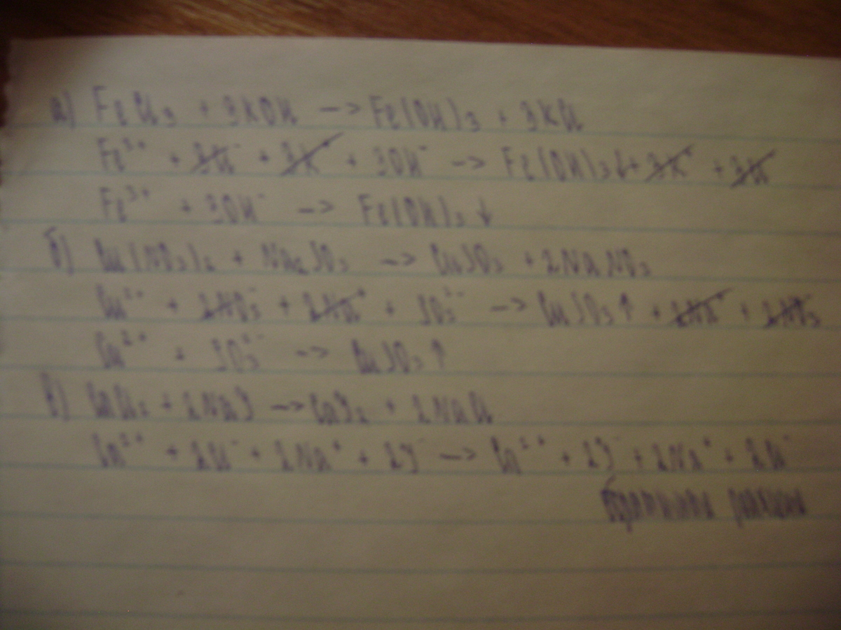 Напишите в молекулярной и ионной формах уравнения реакций взаимодействия между следующими водными растворами: а) хлорида железа (III) и гидроксида калия; б) нитрата меди (II) и сульфита натрия; в) хлорида кальция и йодида натрия.