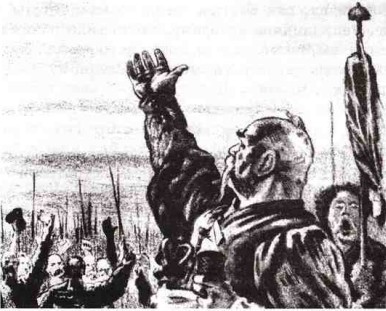 передо мной картина кибрика " тарас бульба" . на картине изображен сам тарас и его войско. я вижу что, тарас поднимает дух войску перед очередным важным боем с поляками. у тараса весьма гордое и отважное выражение лица. лица его воинов не очень хорошо запечатлены на картине. на белом полотне кибрик использовал только черные оттенки, этим он выевляет свой стиль в живописи.