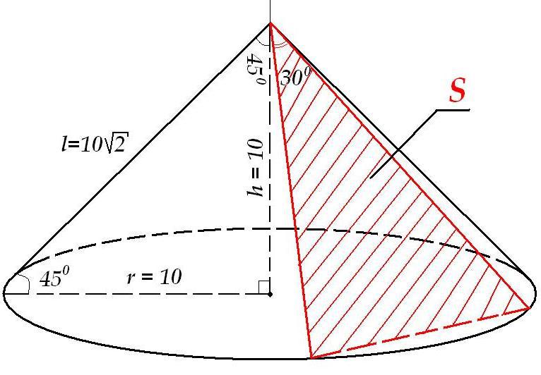 найдите площадь сечения конуса плоскостью проведённой через две образующие угол между которыми равен 30 градусов. напишите решения пожалуйста срочно.