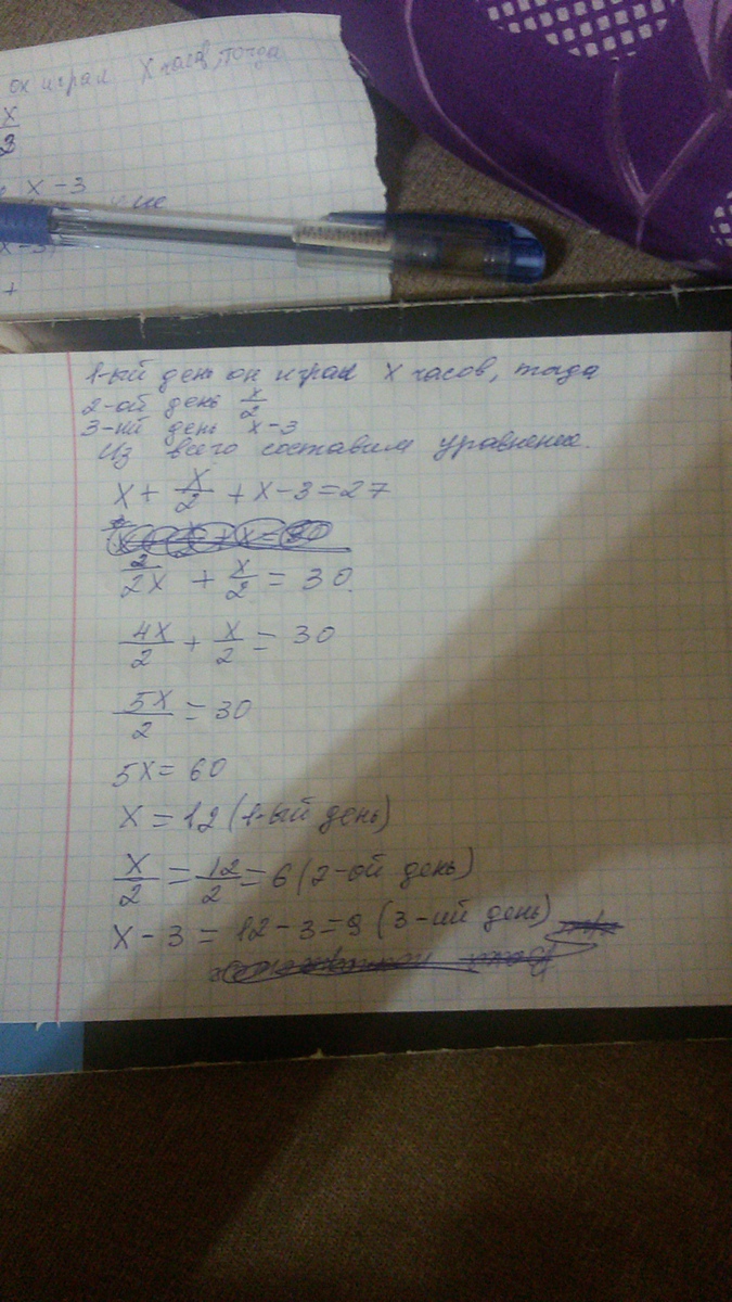 Один мальчик из пятого класса прошёл компьютерную игру за три дня.В первый день он играл в два раза больше времени,чем за второй,а в третий день на три часа меньше,чем в первый.Сколько часов каждый день мальчик сидел за компьютером,если он прошёл всю игру за 27 часов.