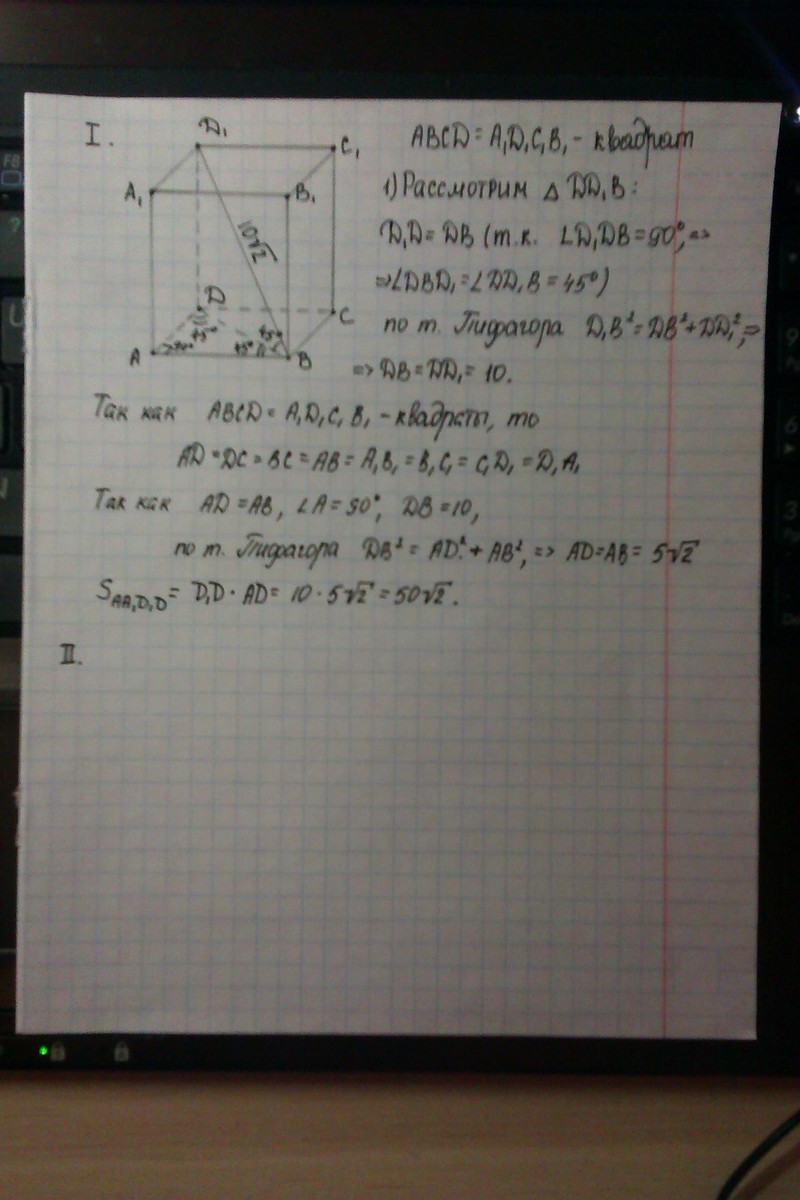 Найдите площадь боковой поверхности правильной четырёхугольной призмы, если её диагональ равна 10корней из 2 см и наклонена к плоскости основания под углом 45 градусов.