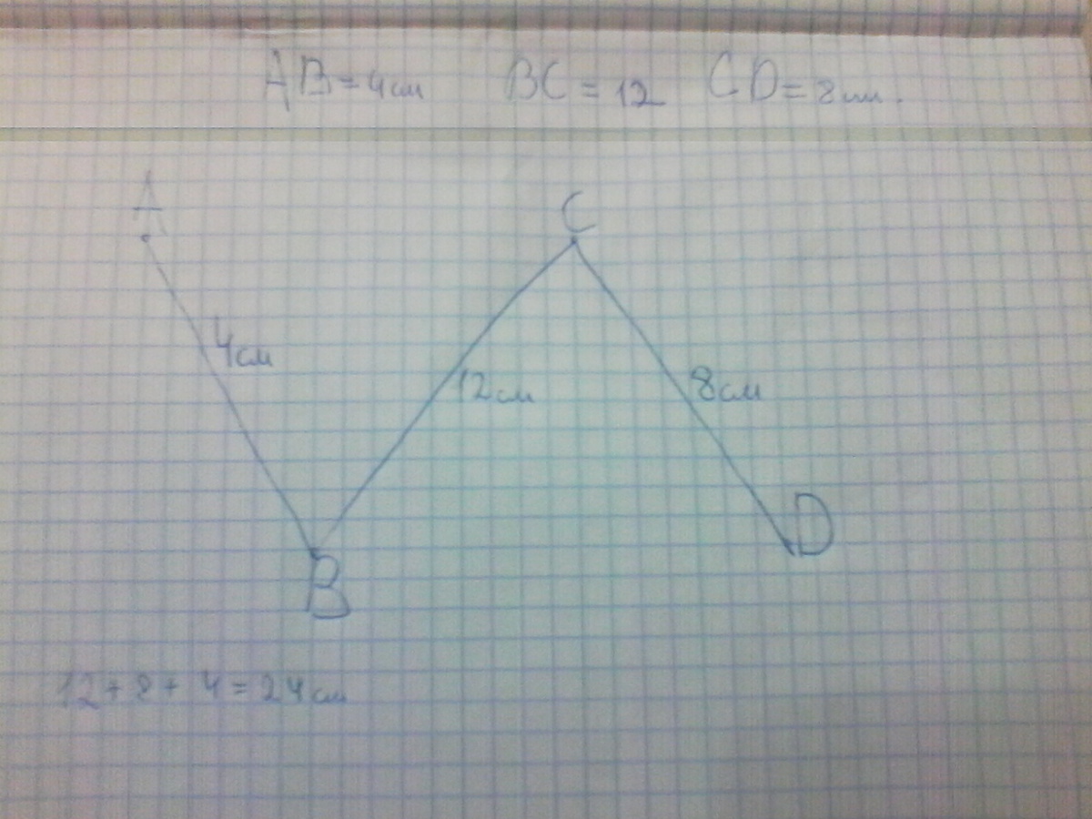 Начертить ломаную АВСD так, чтобы отрезок СD был больше отрезка АВ в 2 раза, а ВС больше АВ в 3 раза.Найди длину ломаной.