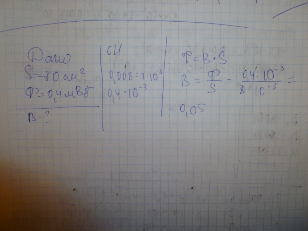 чему равна индукция магнитного поля в которое поместили проводящий контур площадью 80 см квадратных?магнитный поток,пронизывающий контур равен 0,4 мВб