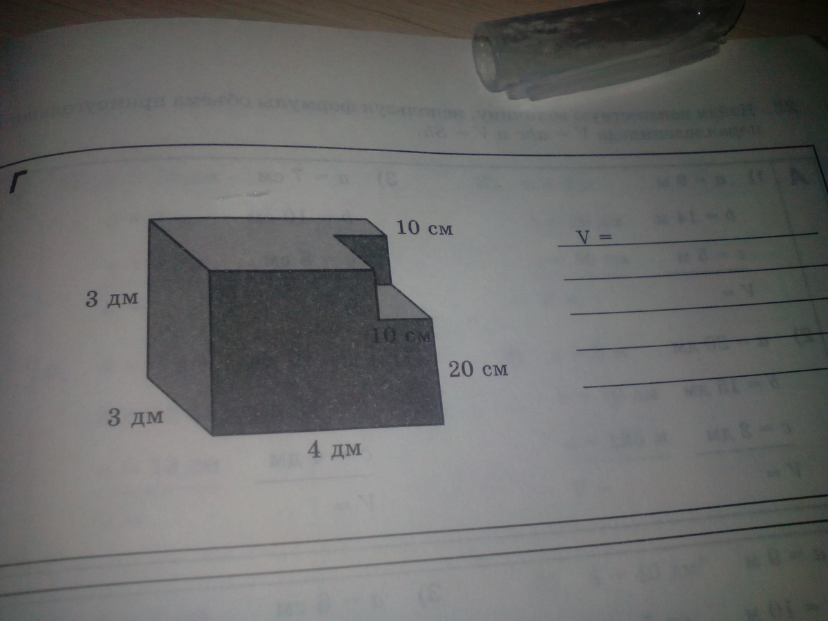 Объем данной фигуры=36-4=32 дм в кубе
