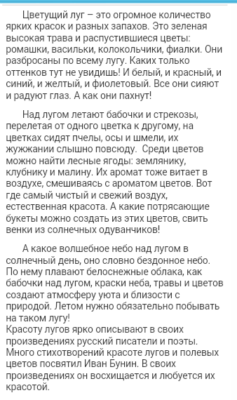 Сегодня утром я встала и вышла на зеленый-зеленый луг. Там я увидела маленькие, круглые и незабываемые ромашки, синенькие лютики и много разных других цветов. Ещена лугу порхали маленькие бабочки, ползали и летали разные насекомые.