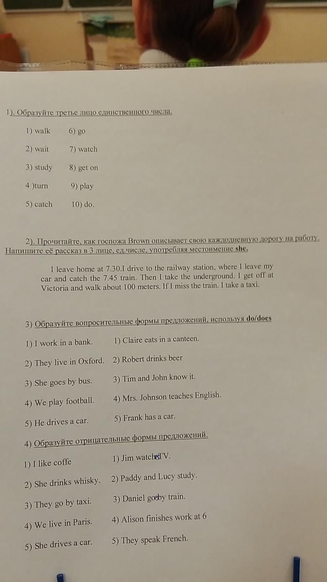she leaves home at 7.30. she drives to the railway staition, where she leaves her car and cath the 7.45 train. then she takes the undegraund. she gets off Victoria and walks aboit 100m. if she musses the train. she takes a taxi
