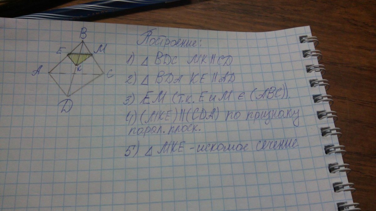 В тетраэдре DABC точка M - точка грани DBC. Построить сечение тетраэдра плоскостью, проходящей через точку M параллельно грани ADC.