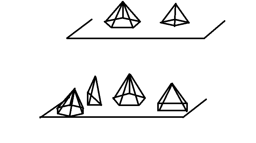 Нарисуй на нижней полке на две пирамидки больше,чем стоит на верхней полке?(на верхней полке 2пирамиды)