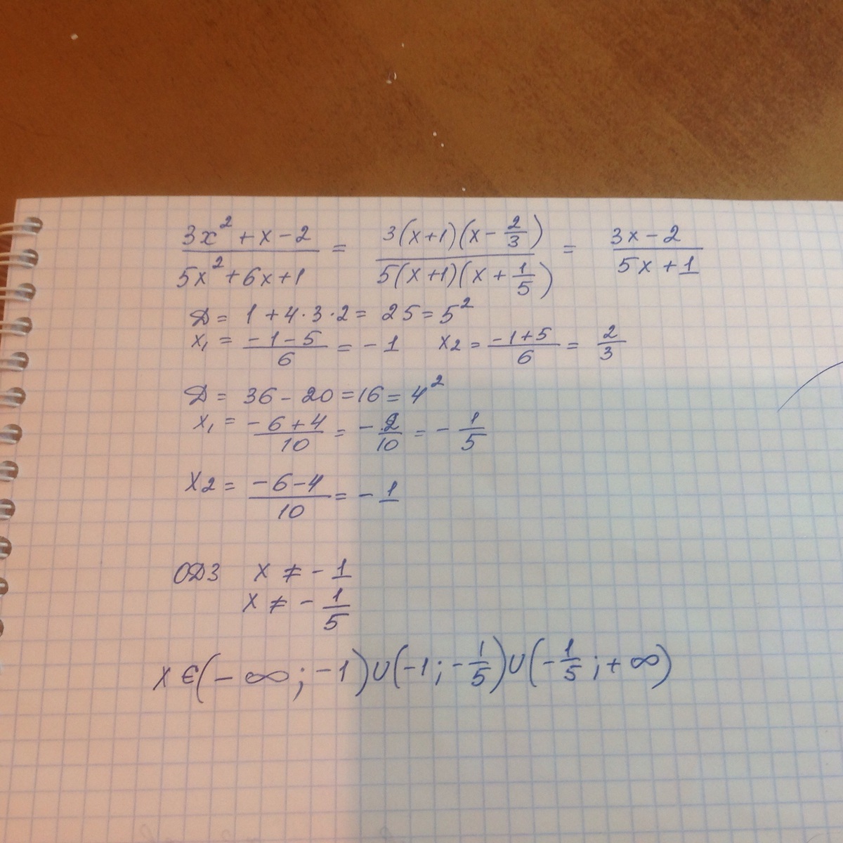 помогите сократить дробь 3х^2+x-2/5x^2+6x+1 и указать допустимые значения переменной.