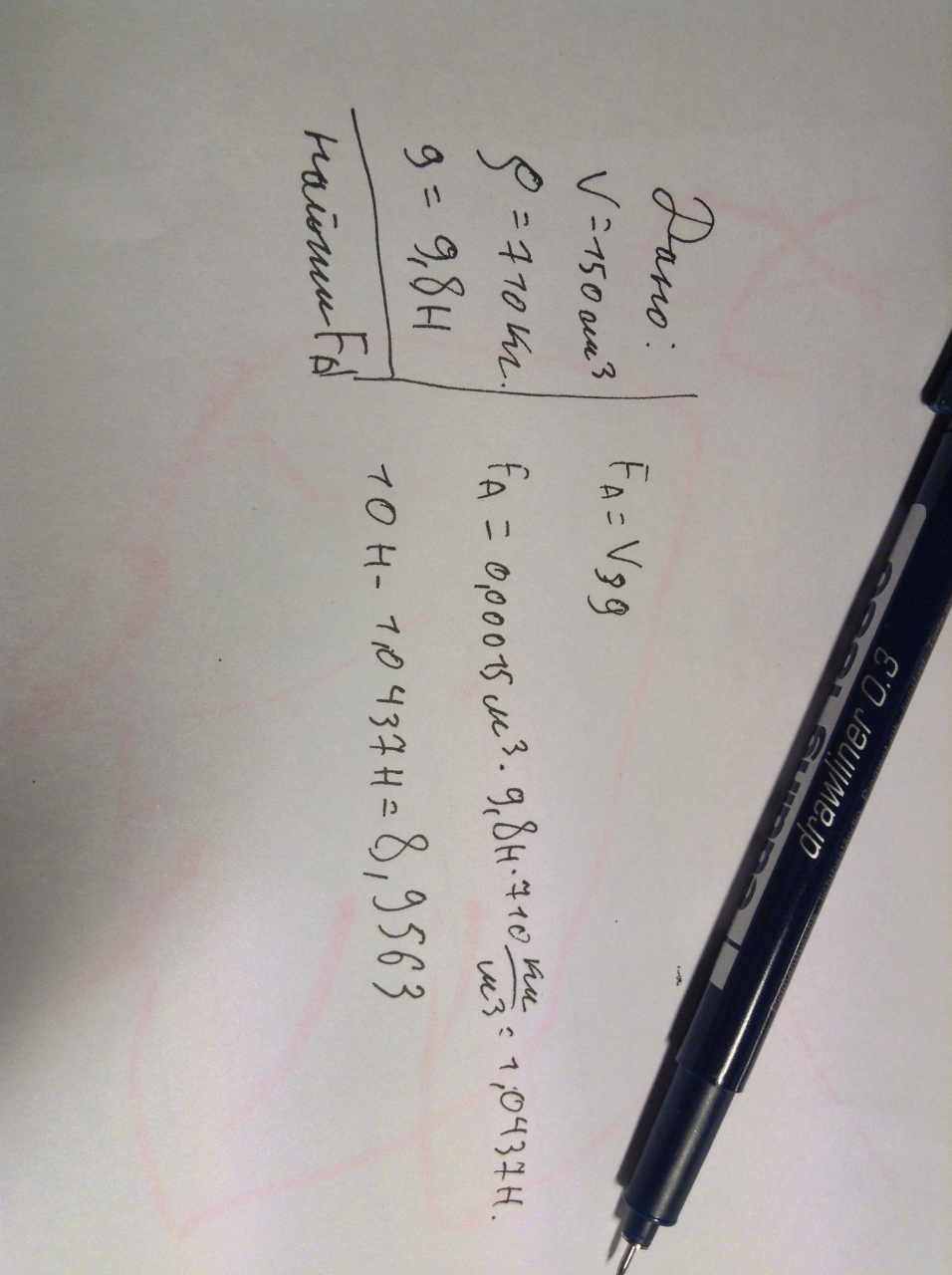Каким будет показание динамометра, если гирю объемом 150см^3 погрузить в бензин? Вес гири в воздухе 10Н