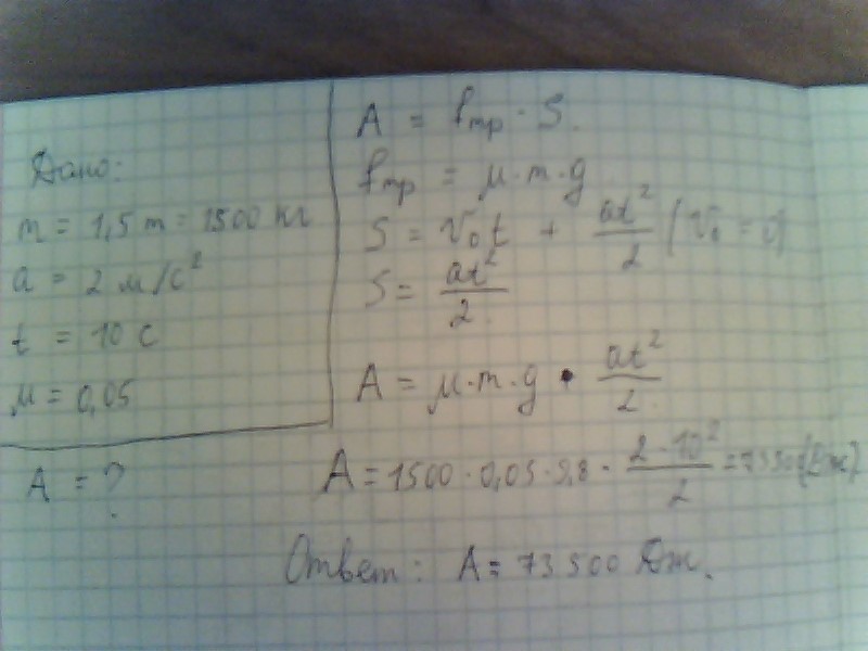 Автомобиль массой 1,5 т разгоняется с ускорением 2,0 м/c² на горизонтальном участке дороги. Какую работу совершит двигатель автомобиля за 10 с, если коэффициент сопротивления движению равен 0,05?