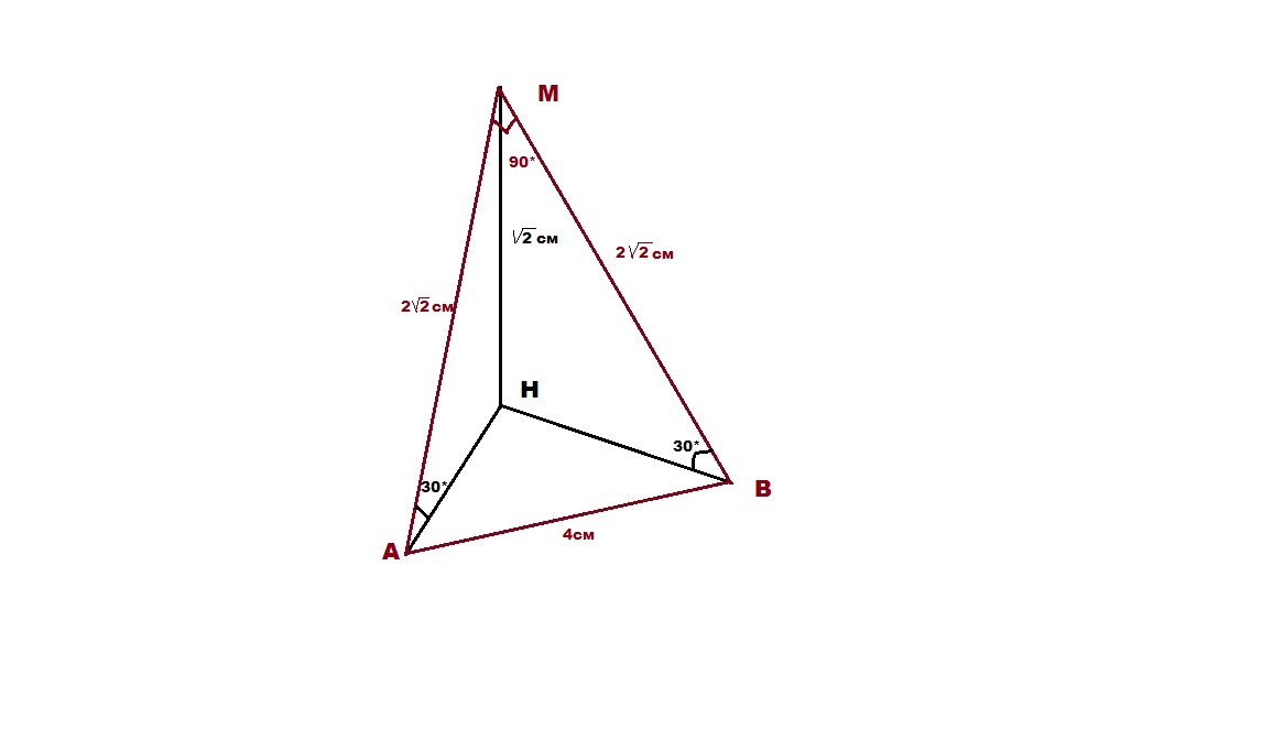 МА и МВ - наклонные , МН=sqrt 2 cm - высота к плоскости альфа. угМАН=МВН=30*