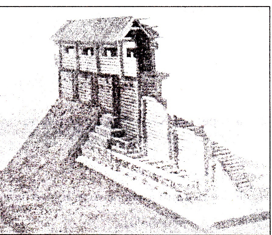 Мне кажется, что это оборонительное сооружение, проще стена, для обороны города. Хорошо просматривается низ постройки - видно, что там лежат какие-то блоки, а сверху земляная насыпь, что говорит о надежности укрепления.Вполне возможно, что эта насыпь также служила защитой от распространения огня, если стену подожгут. Насыпь не пустит огонь в город и не позволит просто так пройти захватчикам на его территорию. Видны бойницы - это окошки для стрельбы из лука например. Т.к. стена сделана из дерева, то можно сказать, что это примерно 12 - 14 век. Скорее всего где-то на территории Киевской Руси. Есть также сведения, что, по-моему за убийство мужа, княгиня Ольга сожгла дотла город при помощи почтовых голубей(не помню что за город). Этих людей, которые жили в этом городе называли древляне и было это, по-моему в 11-12 веке. Поэтому думаю, что эта постройка из того времени.