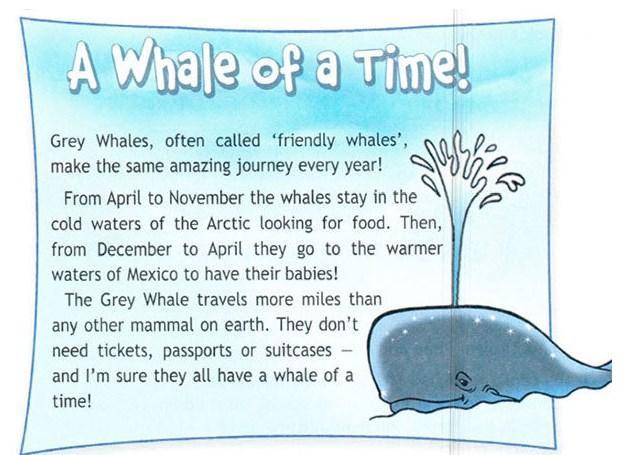 Серые киты,часто называемые дружелюбными,ежегодно совершают одно и то же невероятное путешествие! С апреля по ноябрь киты остаются в холодных водах Арктики,ища пропитание. А затем,с декабря по апрель,они направляются в тёплые воды Мексики,чтобы вывести потомство! Серые киты проплывают больше миль,чем любое другое млекопитающее на планете. Им не нужны билеты,паспорта или чемоданы,и я уверен,что они прекрасно проводят время!