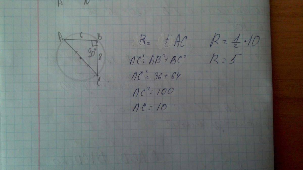 Два катета прямоугольного треугольника равны 6 и 8. Чему равен радиус описанной вокруг этого треугольника окружности?