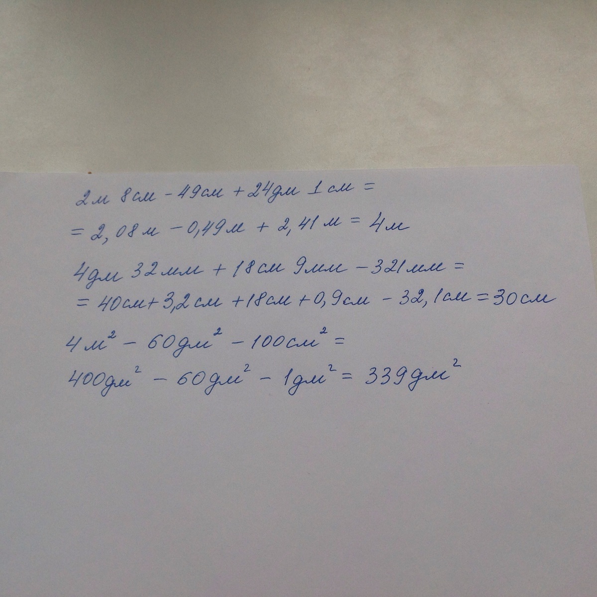 вычислите.выразите результат : в метрах :2 м 8 см-49 см+24дм 1 см: в сантиметрах: 4 дм 32 мм+ 18 см 9мм- 321 мм в квадратных дециметрах: 4 м2 -60 дм2-100 см2
