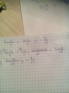 2х-3 разделить на 3 минус х-2 делёное на 5 больше -8 делёное на 15