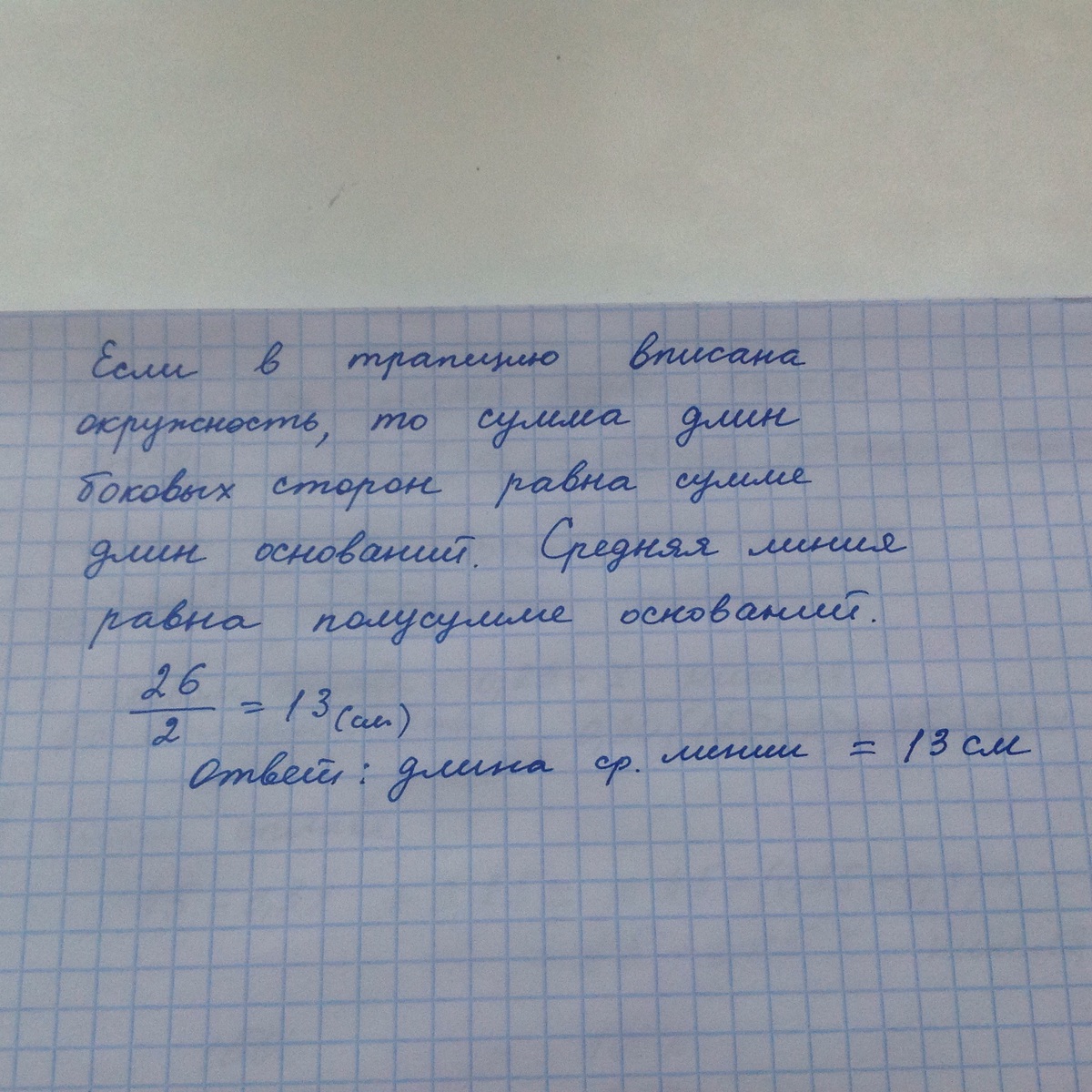 . В трапецию, сумма длин боковых сторон которой равна 26, вписана окружность. Найдите длину средней линии трапеции.