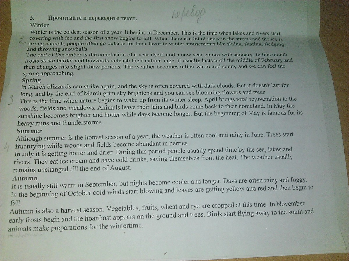 Зима – это самое холодное время года. Она начинается в декабре. В это время озера и реки покрываются льдом, и выпадает первый снег. Когда на улицах много снега, а лед уже достаточно крепкий, люди часто выходят на улицу, чтобы покататься на лыжах, коньках, санках и поиграть в снежки.