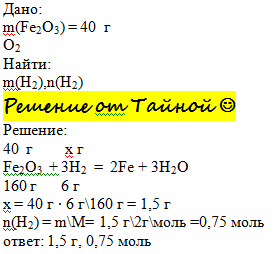 рассчитайте массу и количество вещества водорода, который вступит в реакцию с 40 г Оксида железа 3