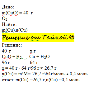 рассчитайте химическое количество и массу cu,которую можно получить путем восстановления водородом из CuO массой 40г