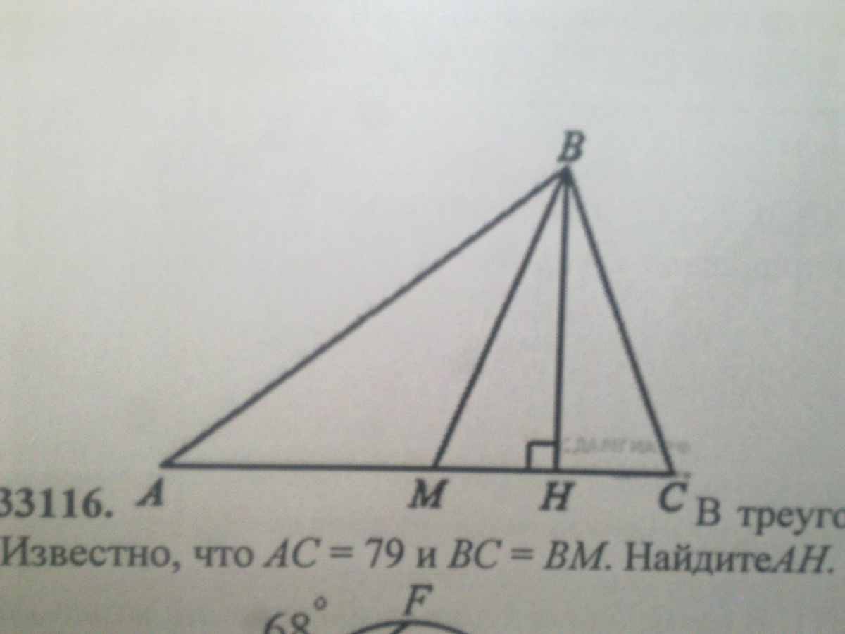 в треугольнике АВС проведена медиана ВМ ивысота ВН. Известно, что АС=79 и ВС=ВМ. Найдите АН.