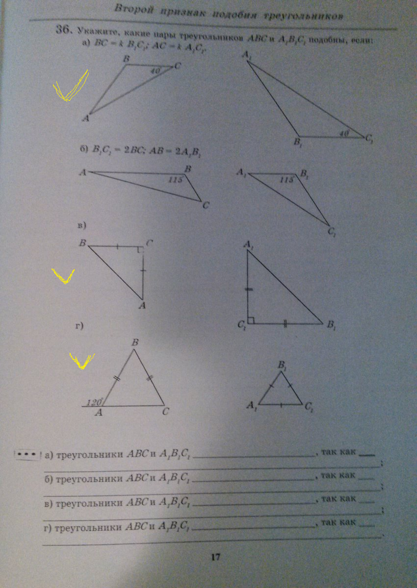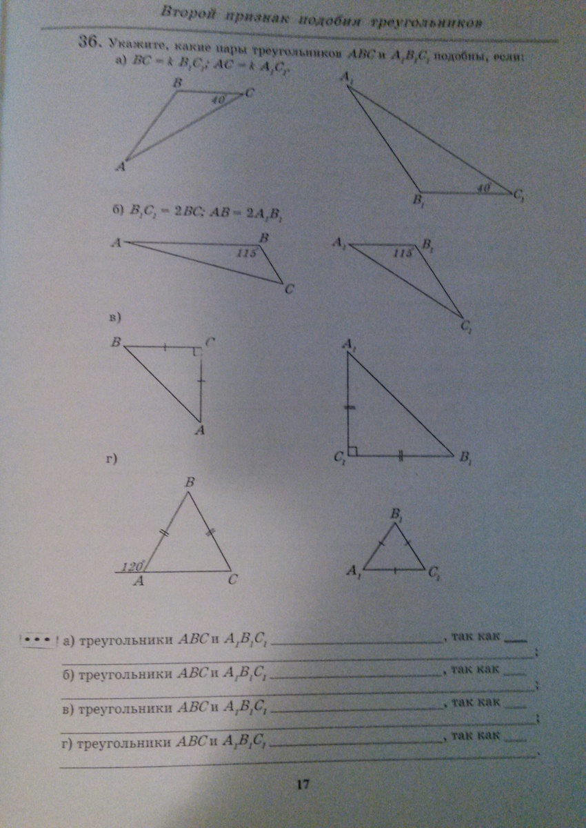 Третья пара подобны, потому справа равносторонний треугольник, все углы в нем по 60°, а слева равнобедренный, один из углов при основании тоже 60⊄, так как он смежный углу в 120°, а в равнобедренном треугольнике углы при основании равны. Поэтому два угла при основании 60°. Но тогда и третий угол при вершине тоже 60°=180°-60°-60°