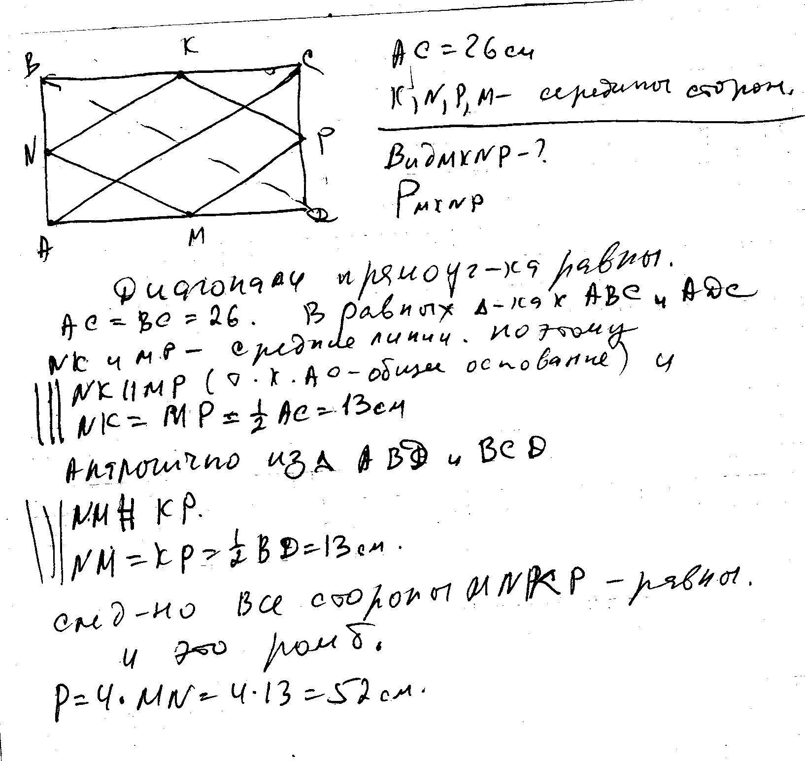 Диагональ прямоугольника равна 26 см. Середины его сторон последовательно соединены отрезками. a) вычислите периметр образовавшегося четырехугольника . б) Определите вид образовавшегося четырехугольника (ответ поясните.)
