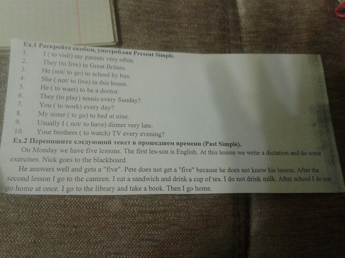 2.On Monday we had five lessons.The first lesson was Russian.At this lesson we wrote a dictation and did some exercises.Nick went to the blackboard. He answered well and got a five.Pete did not get a five because he did not know his lesson.After the second lesson i went to the canteen.I ate a sandwith and drank a cup of tea.I did not drink milk.After school i did not go home at once.I went to the library and took a book. Then I went home.