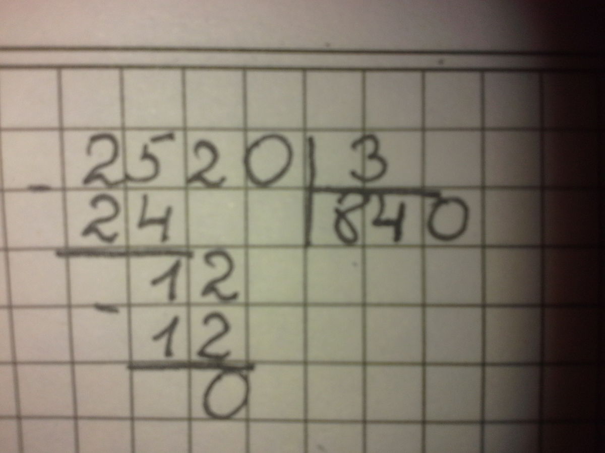 2520:3=пять разделить на 3 нельзя значит делим 25:3=8(25-24=1), сносим к 1 2 получается 12; 12:3=4 да + ноль =840