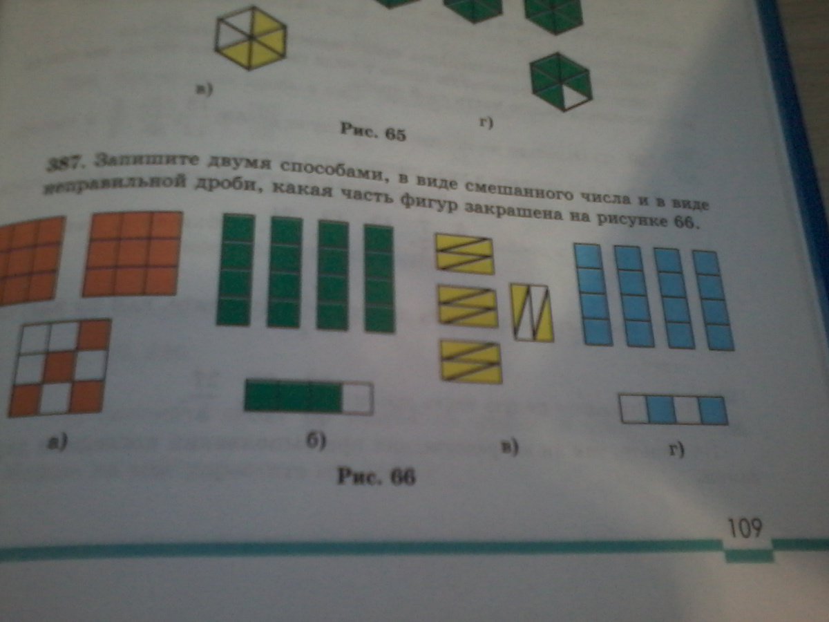 запишите 2 спосбами , в виде смешанного числа и в виде неправильной дроби, какая часть фигур закрашена на рисунке 66