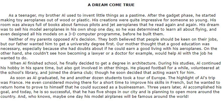 Когда Ал выпустился,то как и другие студенты,отправился в тур по Европе. Контрольным пунктом его поездки стала Франция. Он даже думал,что его пребывание там помогло улучшить его французский,но он хотел вернуться домой,чтобы доказать себе,что он может быть успешным бизнесменом. Через три года Ал достиг своей цели и сегодня он успешен: в нашем городе пять его магазинов и сеть будет расширяться ещё. И,кто знает,может быть в один прекрасный день его модельки станут известны во всём мире.