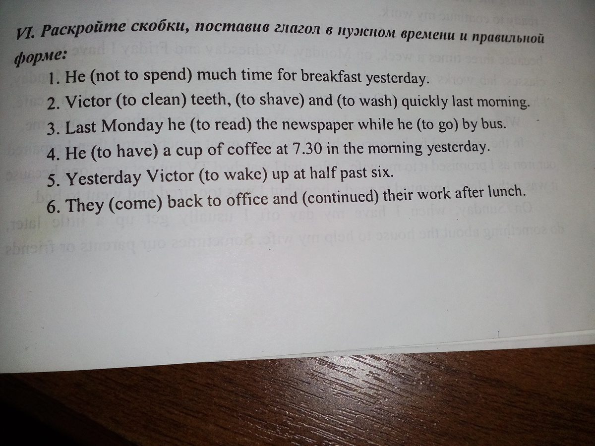 1. didn't2. cleaned, shaved, washed /was cleaning, was shaving, was washing3. read, he was going.4. was having5. woke6. come, continued