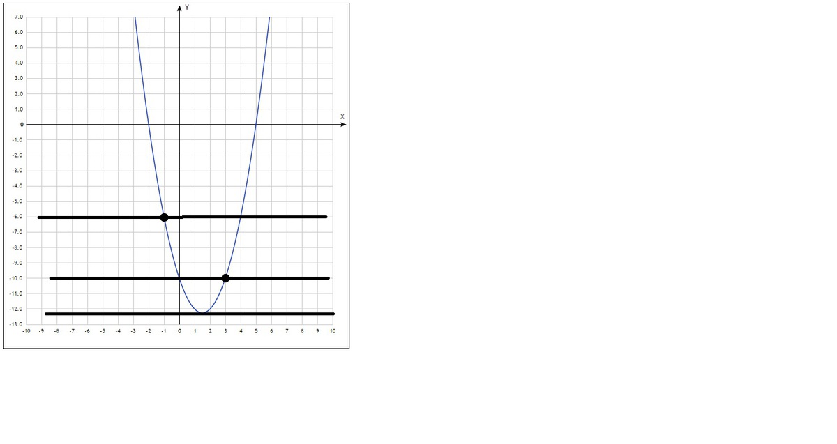 Как видно, одна общая точка получается, если прямая проходит через вершину параболы или через одну из выколотых точек. m=-10; m=-6; третья точка: вершина параболы в x=1,5 y=-12,25; m=-12,25. Ответ: m=-12,25; m=-10; m=-6