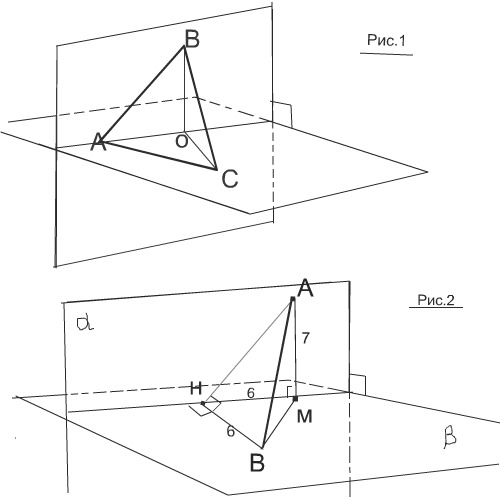 2) Концы отрезка AB лежат в двух перпендикулярных плоскостях и удалены от прямой их пересечения на 6 и 7. Найти длину отрезка AB, если расстояние между основаниями перпендикуляров, проведенных из точек A и B к прямой пересечения равны 6.