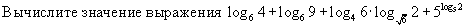 4. log6#4+log6#9+log4#6*log_sqrt(6)#2+5^log5#2=log6#36+log4#6*log_sqrt(6)#2+2=4+1(log6#4) * 2log6#2=4+1(2log6#2) * 2log6#2=4+1=5