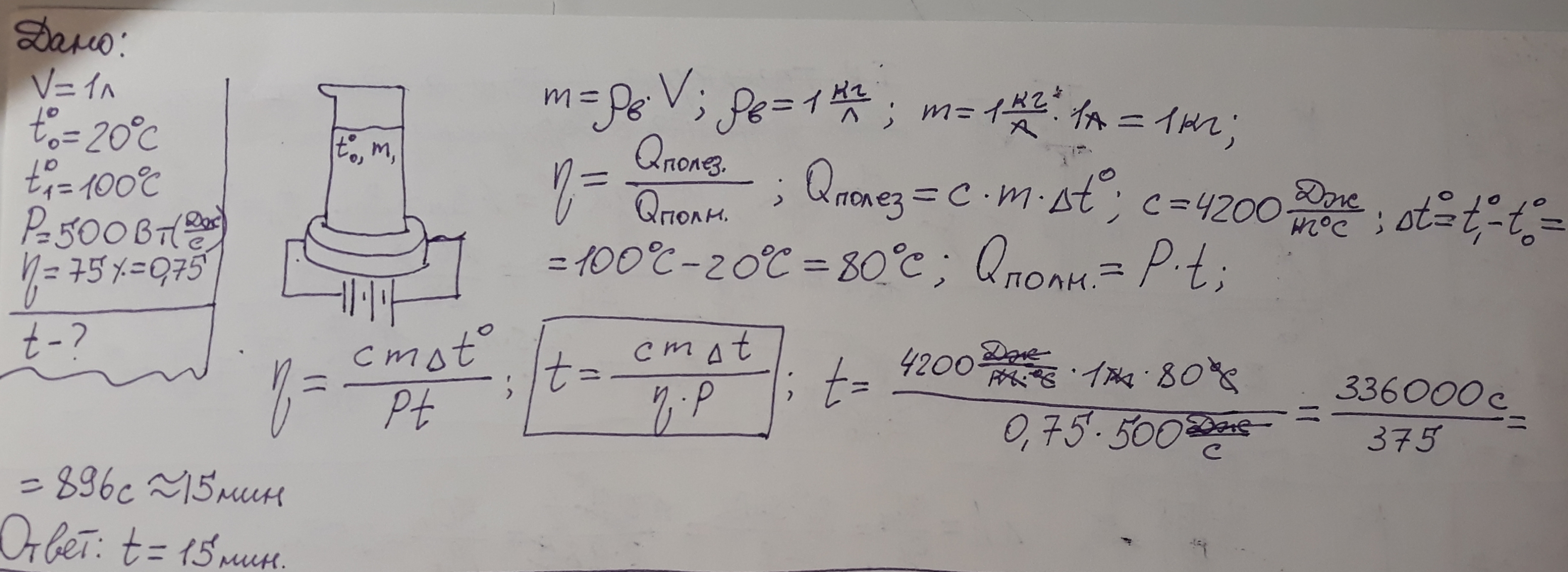 Сколько времени будет нагреваться вода объёмом 1л от температуры 20°С до 100°С в электрическом чайнике мощностью 500 Вт, если его КПД равен 75%?