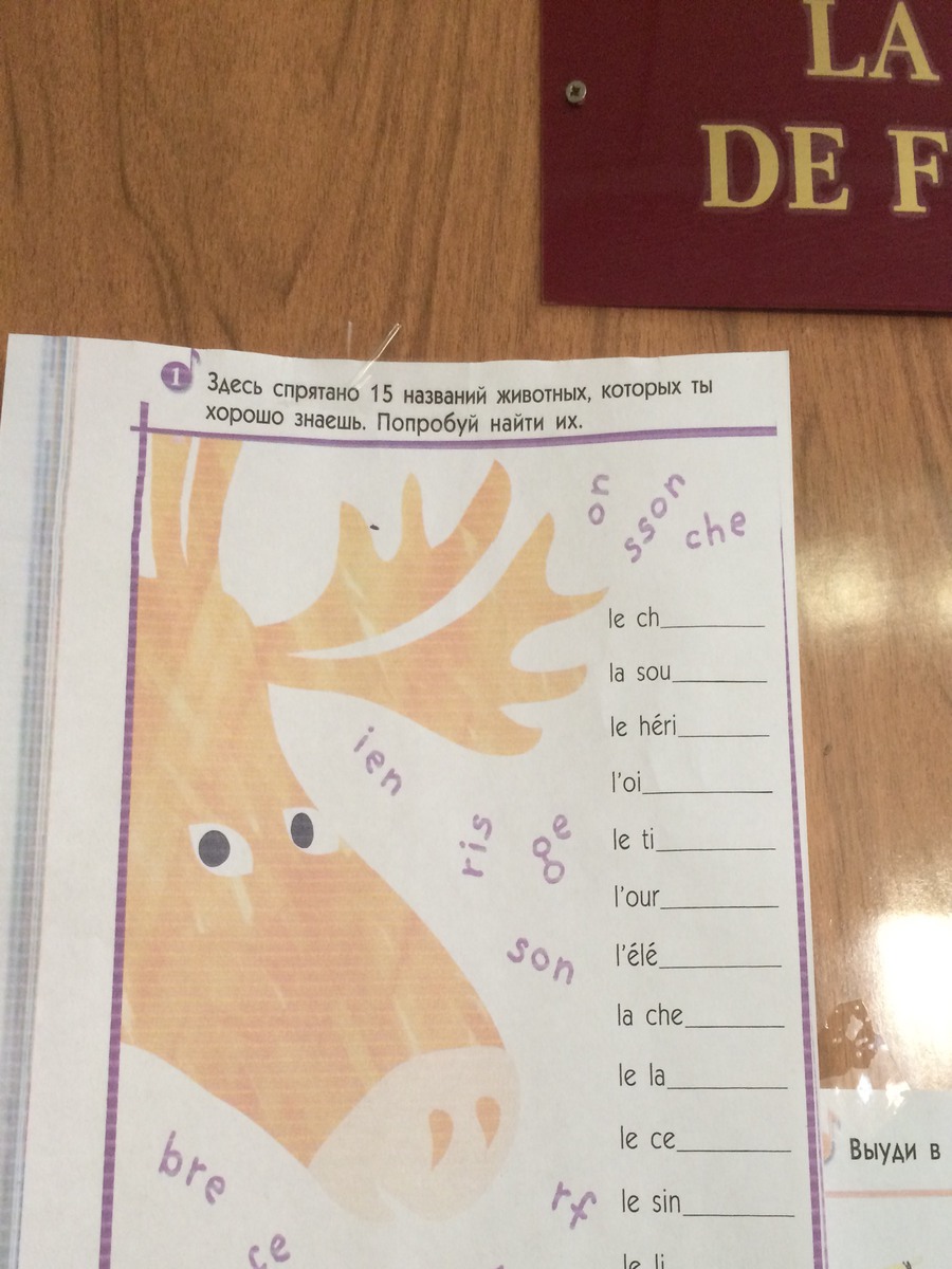 le chien(собака), la souris(мышь), le hérisson(ежик), l'oiseau(птица), le tigre(тигр), l'ours(медведь), l'éléphant(слон), la chévre(коза), le lama(лама), le cerf(олень), le singe(обезъяна), le lion(лев)