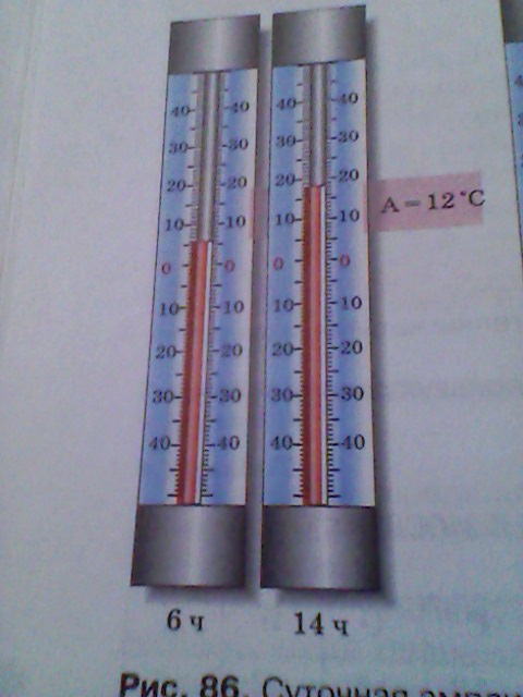 Амплитуду можно определять для суток (суточная амплитуда) , месяца , года . Например , если наибольшая температура за сутки равна +20'С , а наименьшая +8'С , то суточная амплитуда составит 12'С (рис. 86 во вложениях)
