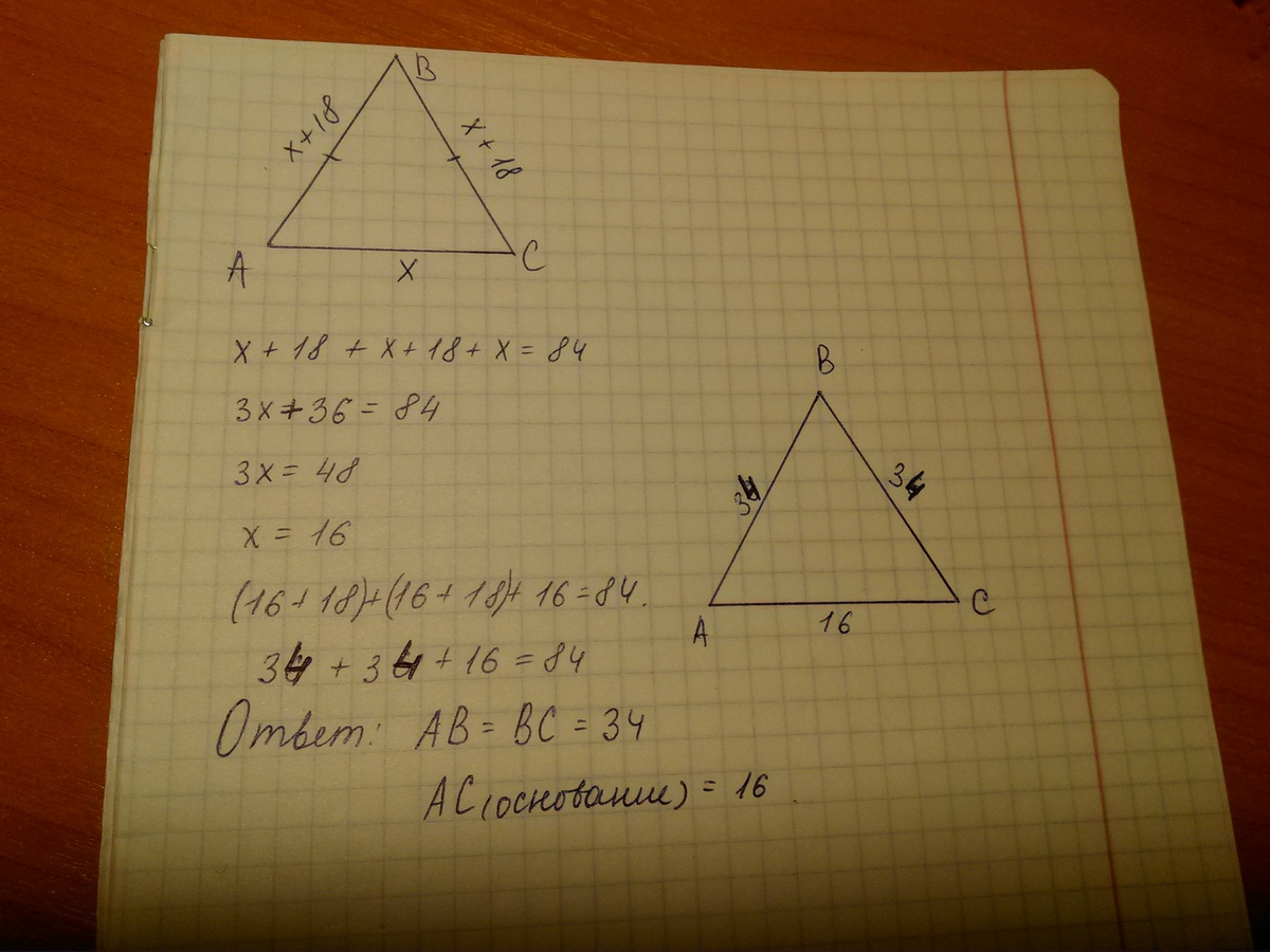 Найдите стороны равнобедренного треугольника если его периметр равен 84 см , а боковая сторона на 18 см больше основания