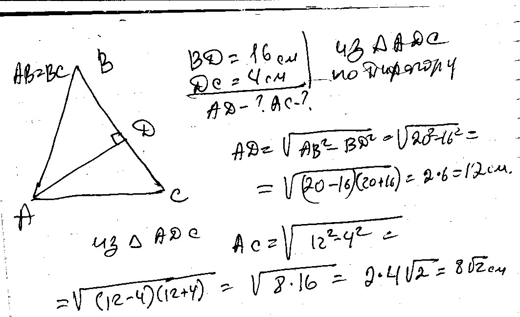 на рисунке треугольник АБС равнобедренный с основанием АС , АD его высота, BD=16см, DC= 4см. Найти основание АС и высоту AD
