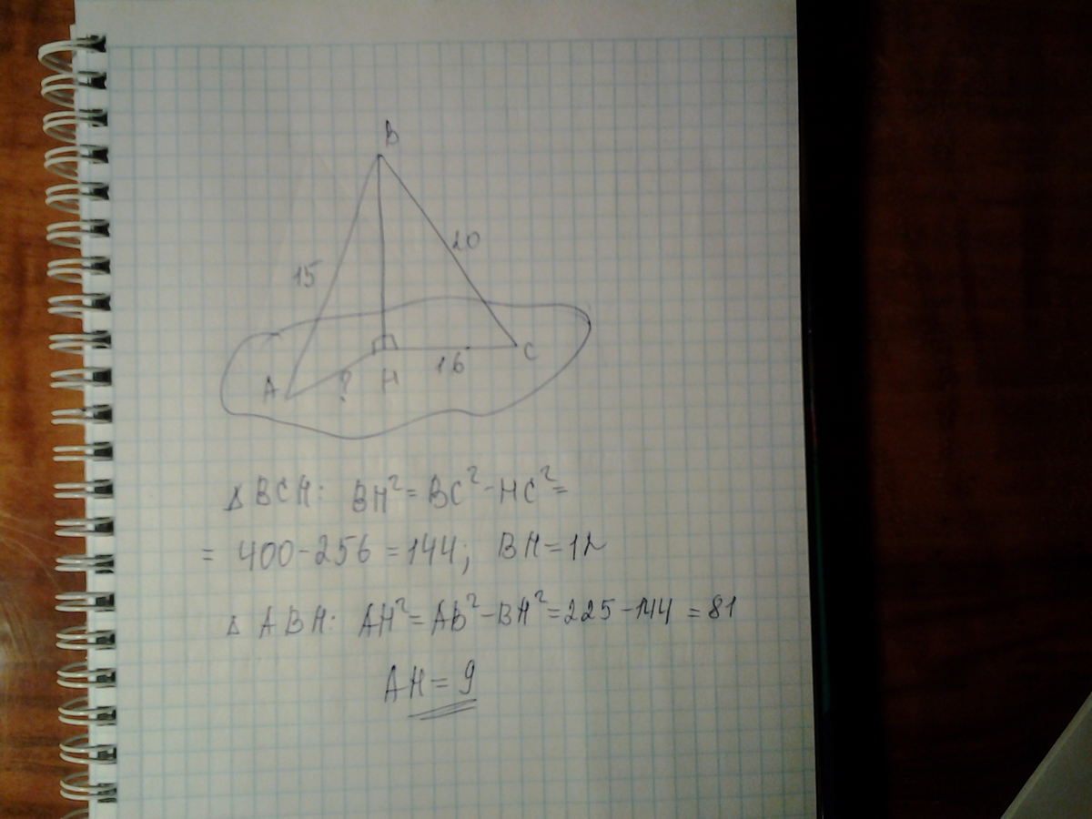 Отрезки двух наклонных, проведенных из одной точки к плоскости, равны 15 см и 20см, проекция одного из этих отрезков равна 16 см. Найдите проекцию другого отрезка.