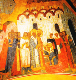 Наверное, крещение Руси. В центре князь Владимир, а к нему подходят византийкие принцы.