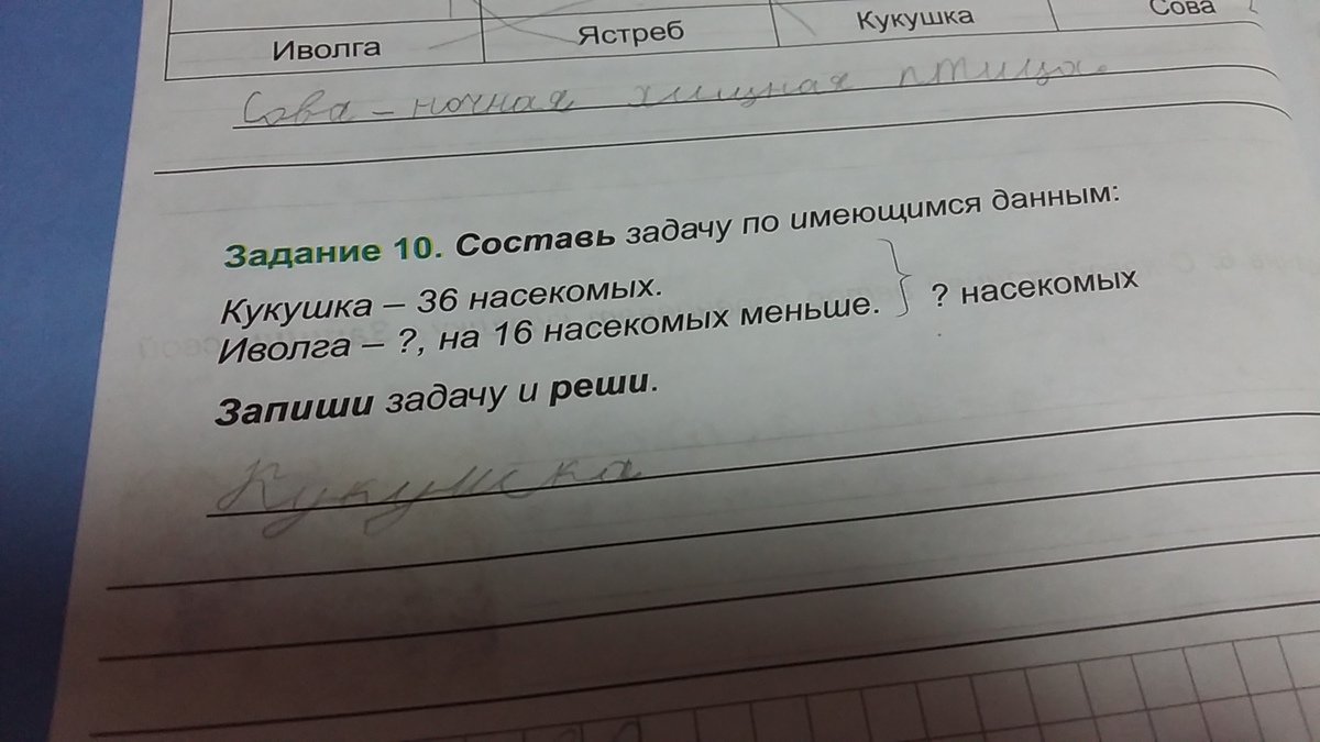 Кукушка съела 36 насекомых, а иволга на 16 насекомых меньше. Вопрос: сколько насекомых съела иволга? Сколько насекомых съели обе птицы?